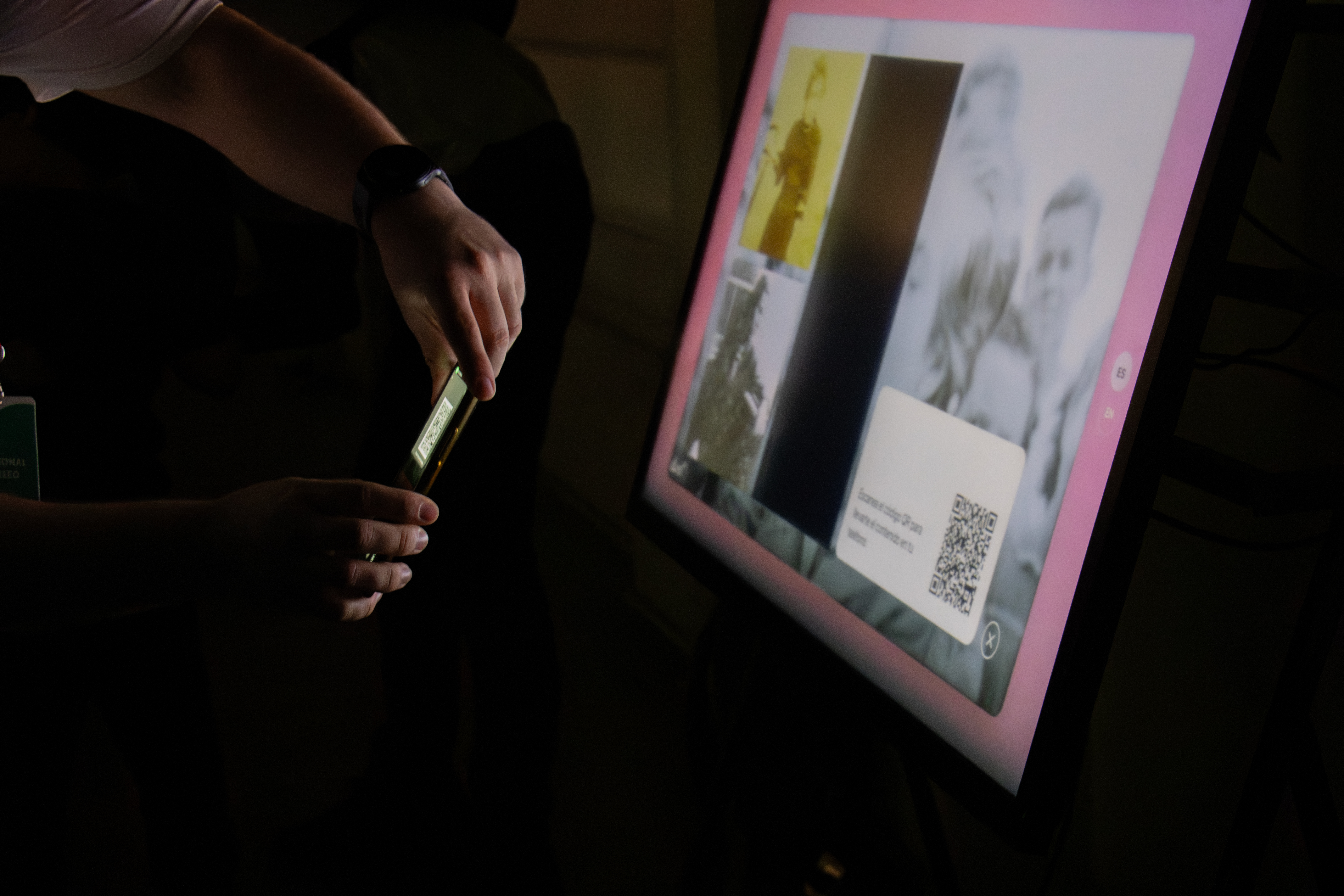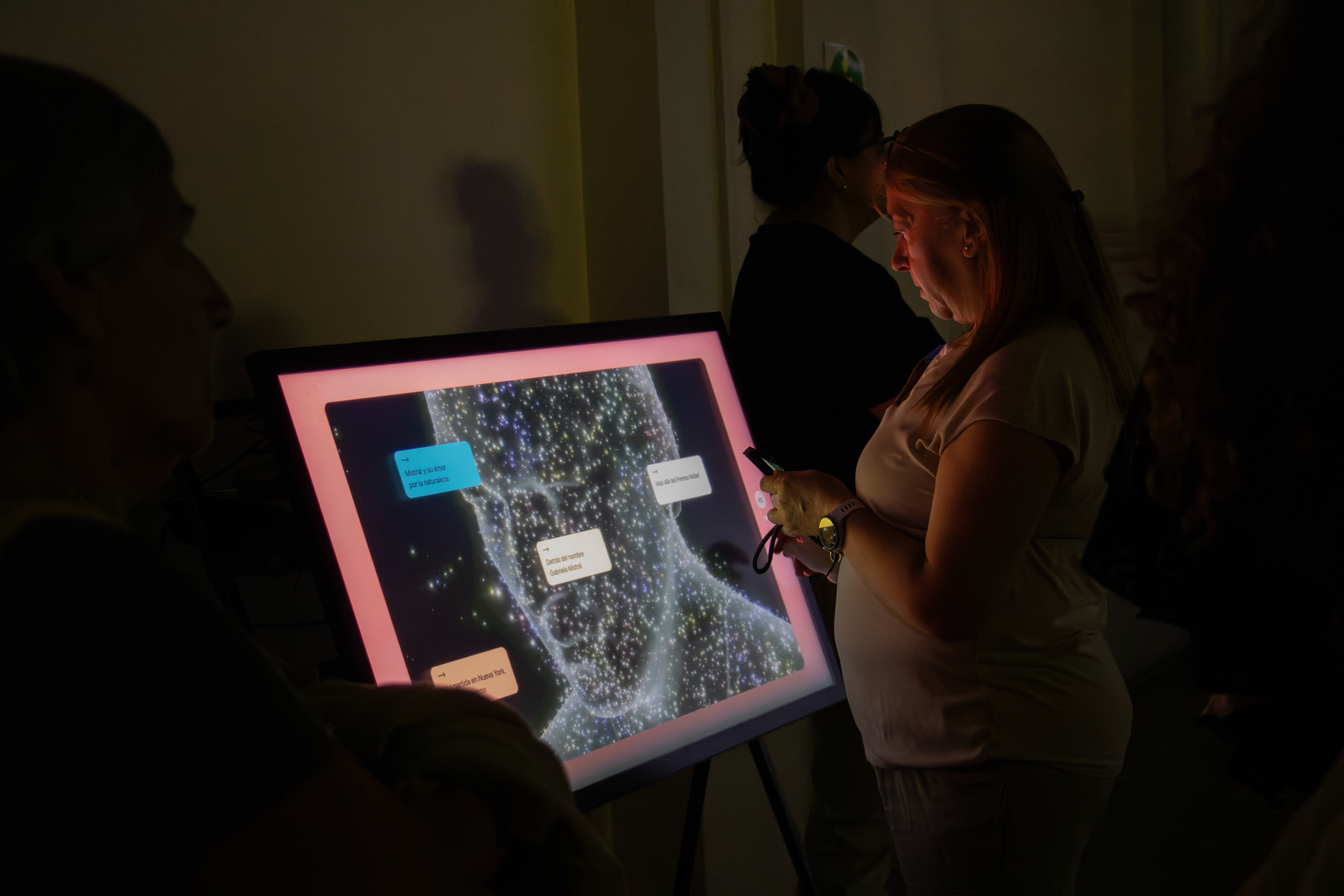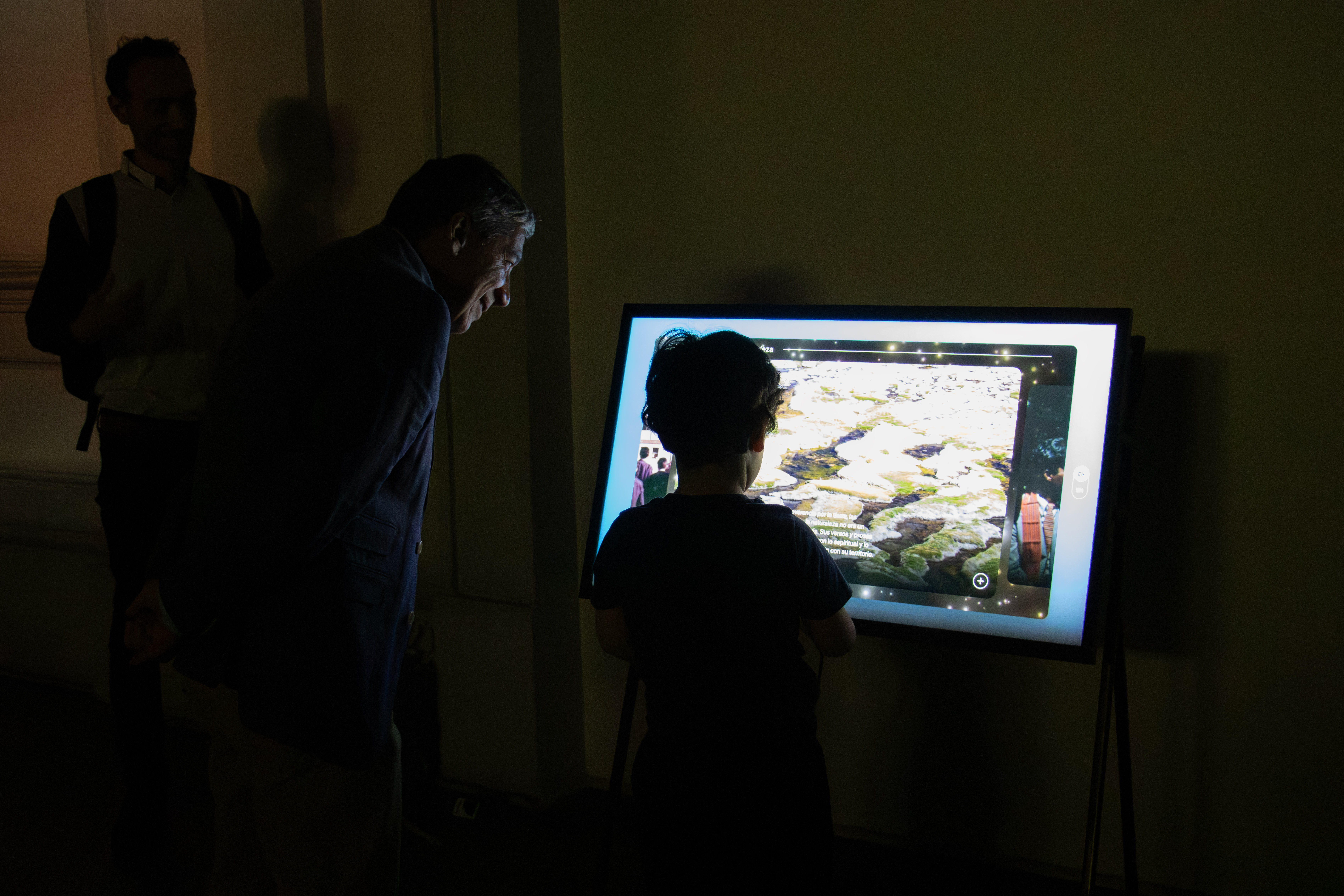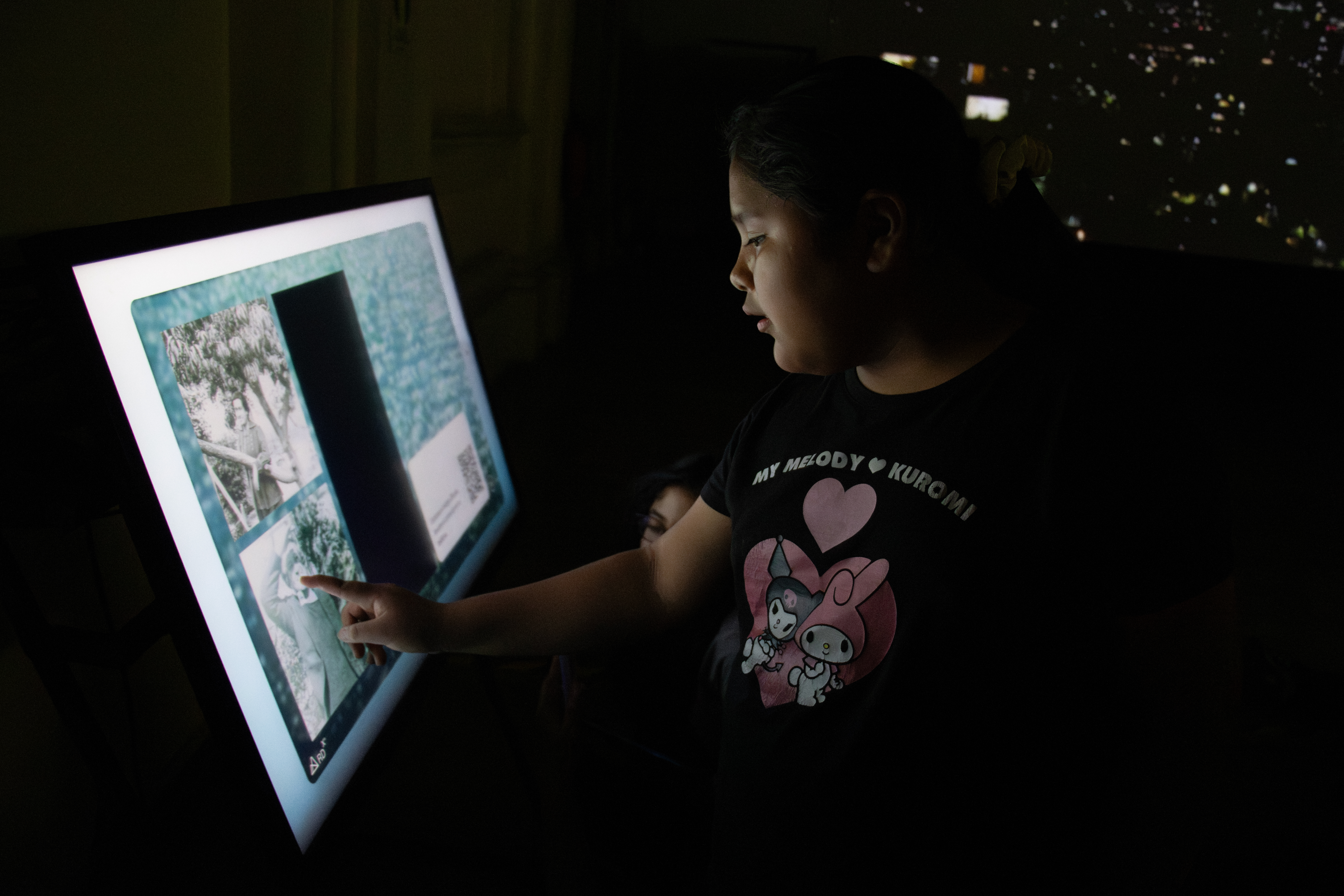 La exhibición incorpora además una pantalla táctil donde las y los visitantes pueden navegar por contenidos ampliados, prolongando la experiencia más allá del espacio físico.