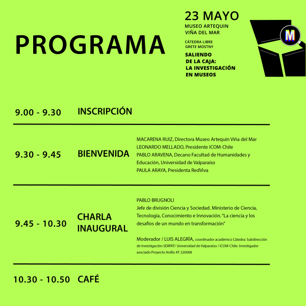 La actividad –cuyo horario es de 09:00 a las 17:30 horas– comenzará con los saludos del presidente del ICOM Chile, Leonardo Mellado, de la directora del Museo Artequin Viña del Mar, Macarena Ruiz, Pablo Aravena, decano Facultad de Humanidades y Educación, de la Universidad de Valparaíso, y Paula Araya, presidenta RedViva.