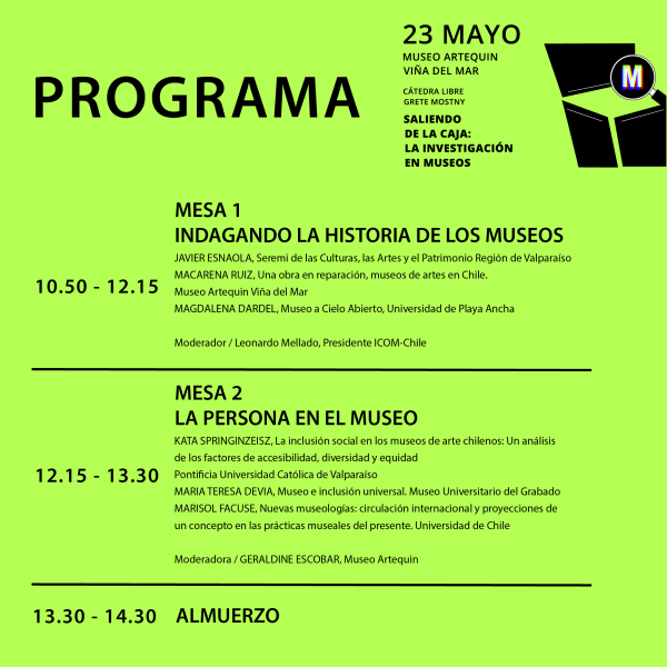 La jornada de la mañana continuará con mesas de conversación en la que participan destacados profesionales nacionales, entre ellos: Javier Esnaola, seremi de las Culturas, las Artes y el Patrimonio Región de Valparaíso; Macarena Ruiz, directora del Museo Artequin Viña del Mar; Kata Springinzeisz, profesora de la Pontificia Universidad Católica de Valparaíso; Maria Teresa Devia, directora del Museo Universitario del Grabado, y Marisol Facuse, académica de la Universidad de Chile.