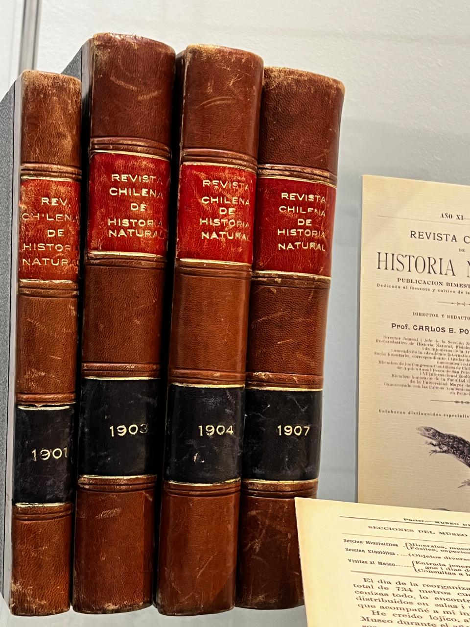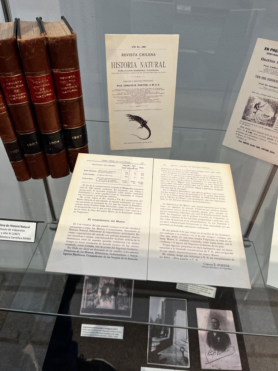 La vitrina central, dedicada a los documentos históricos, representa uno de los pilares fundamentales del museo: su Biblioteca Científica John Juger. A través de estos registros, el público puede conectar con los orígenes del museo y comprender cómo la tragedia de 1906 marcó el inicio de un nuevo ciclo. Esta sección rinde homenaje a figuras como Carlos Porter y sus pares, quienes trabajaron incansablemente para recomponer las colecciones y reactivar la vida científica del museo.
