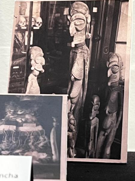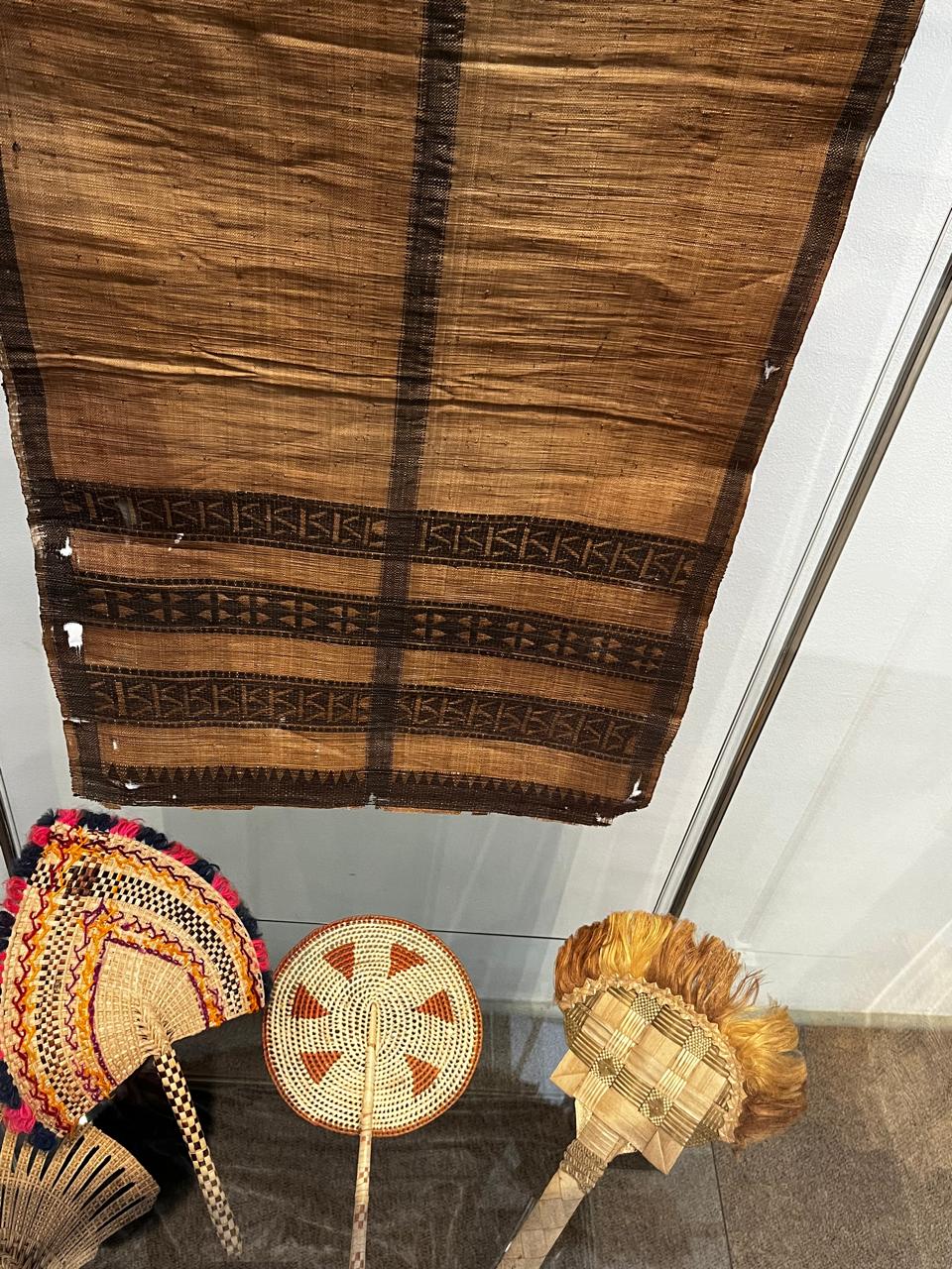 A su costado izquierdo, la vitrina de las colecciones patrimoniales presenta objetos pertenecientes a la colección de Oceanía, donada por Óscar Poppe y Renato Castro, cuya generosidad reflejó el espíritu de colaboración y solidaridad que permitió reconstruir el acervo del museo tras la catástrofe.