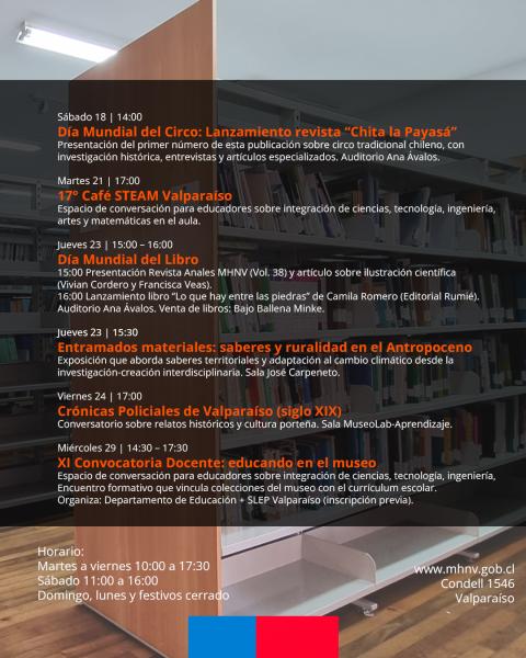 El Museo de Historia Natural de Valparaíso da a conocer su cartelera de actividades para el mes de abril, una programación que reúne una amplia variedad de iniciativas orientadas a públicos de todas las edades, promoviendo el acceso al conocimiento, la reflexión y la participación en torno a las ciencias, las artes y el patrimonio.