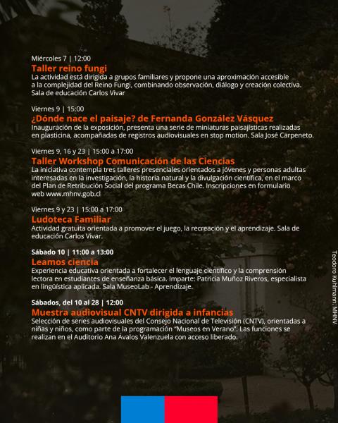 Durante enero de 2026, el museo se suma nuevamente a la programación nacional Museos en Verano, iniciativa que invita a la comunidad a vivir el período estival a través de experiencias culturales, educativas y recreativas, con acceso liberado y actividades especialmente diseñadas para públicos diversos. En este contexto, el museo ha preparado una amplia cartelera de actividades que articula ciencia, patrimonio, arte, medioambiente y divulgación, reforzando su rol como espacio abierto al aprendizaje y al encuentro ciudadano.