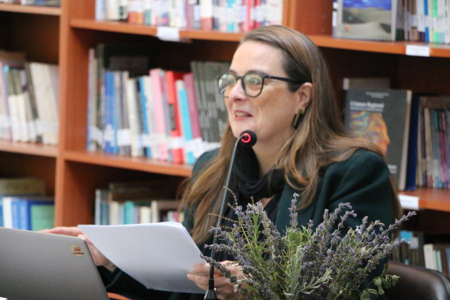 El tramo de la tarde abrió con la charla magistral de Fernanda Glaser Danton, psicóloga y doctora en Estudios de Género y Globalización por la State University of New York. Su presentación propuso una lectura articulada a partir de los recados y del pensamiento geopolítico de Gabriela Mistral como diplomática e intelectual del siglo XX, vinculándola con mujeres del presente que continúan luchas afines como la defensa de los derechos humanos, el feminismo, la protección de trabajadores migrantes y la aspiración a un mundo más justo para las nuevas generaciones. Luego, Soledad Falabella Luco —doctora por UC Berkeley y profesora de la Universidad de Chile— reflexionó sobre la dignidad de las mujeres en la trayectoria pública mistraliana, vinculando su obra con debates contemporáneos en torno a la justicia y el lenguaje. Cerró la jornada la presentación de María Carolina Bergese, investigadora argentina de la Universidad Nacional de Mar del Plata, quien propuso un mapa posible para acercarnos a las conferencias públicas de Mistral como intelectual latinoamericana.