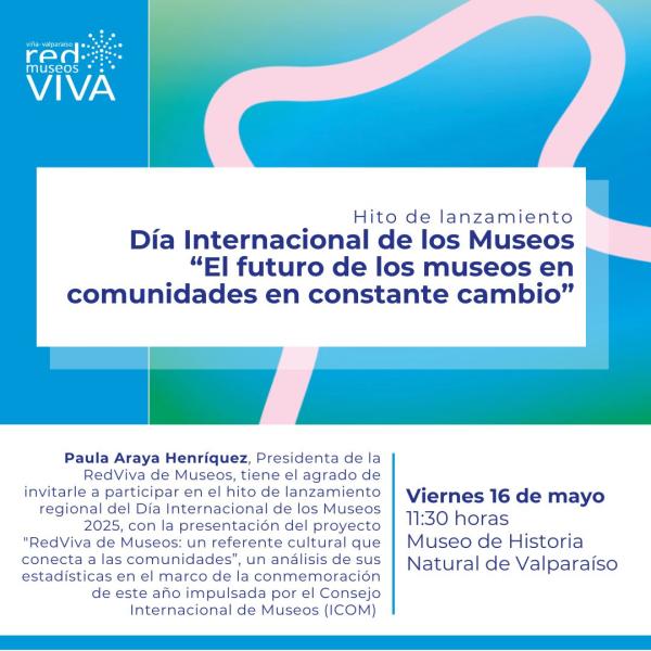 El próximo viernes 16 de mayo, a las 11:30 horas, el Museo de Historia Natural de Valparaíso será el escenario del lanzamiento regional del Día Internacional de los Museos 2025, bajo el lema "El futuro de los museos en comunidades en constante cambio". Este evento es organizado por la RedViva de Museos y contará con la presencia de su presidenta, Paula Araya Henríquez.